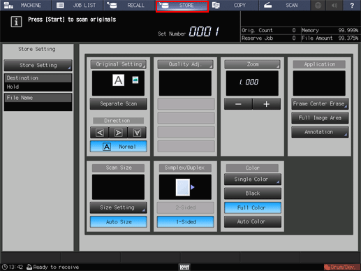 2. Press Store Setting, and then specify a destination and assign a name to the job.