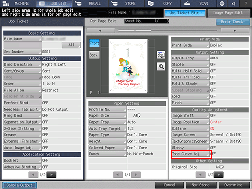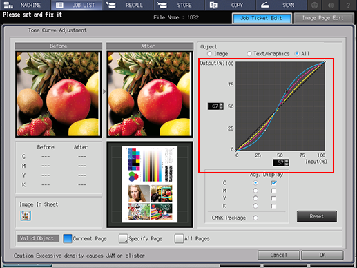 You can adjust each color's overall brightness and contrast by changing the tone curve of each CMYK or the tone curve of CMYK package to the image data in the hold job. You can also adjust the tone curve of each tag (Image or Text/Graphics).