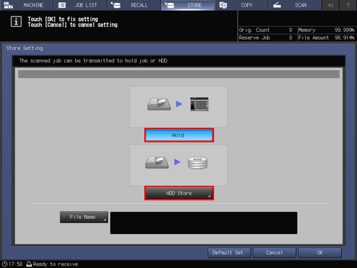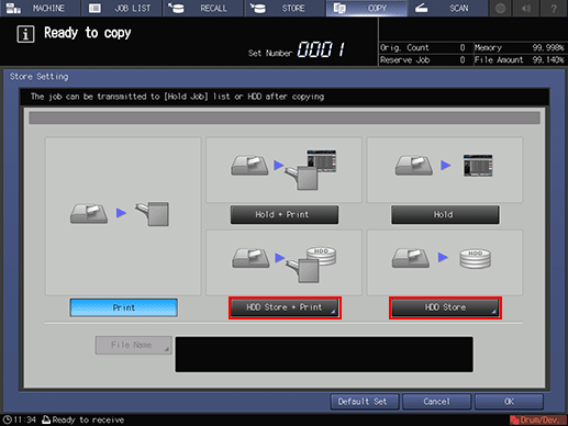 With HDD Store selected, a job is held or stored on the HDD without being copied.