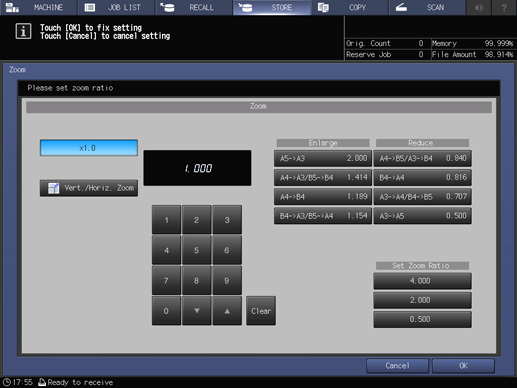 Press the keypad on the screen, then enter the desired zoom ratio to highlight it. This value can be specified between 0.250 and 4.000.