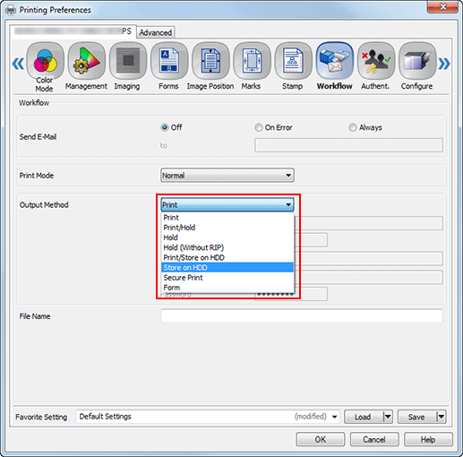 From the Output Method pull-down menu, select Print/Store on HDD or Store on HDD.