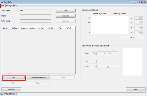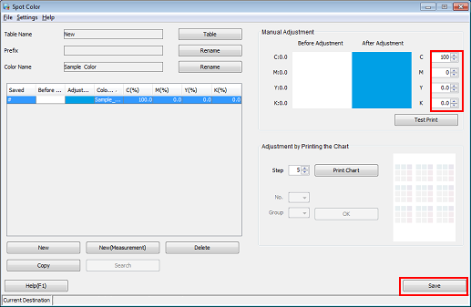 supplementary explanationWhen printing, the spot color tables are searched from the top of the table on the Spot Color screen. If the same spot color is saved in more than one spot color table, the first spot color found is applied.
