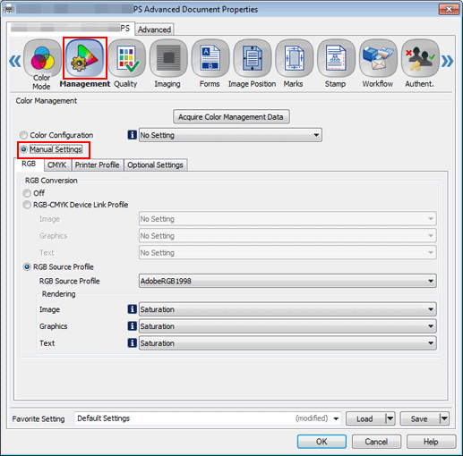 • supplementary explanationIt is recommended that frequently used color output settings be registered in the color configuration. (Refer to About Color Configuration.)