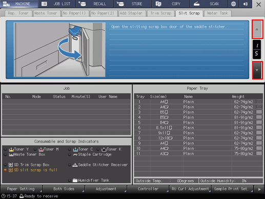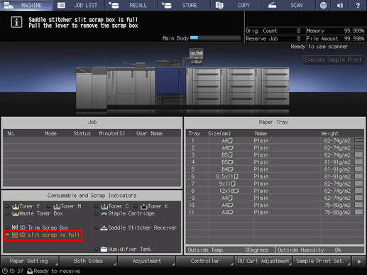 When the saddle stitcher slit scrap box of Saddle Stitcher SD-513 becomes full, the following message appears in the message area of the screen.