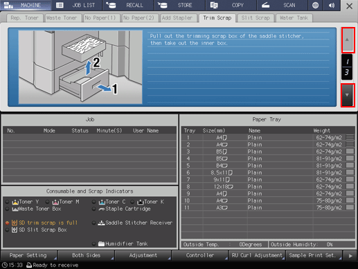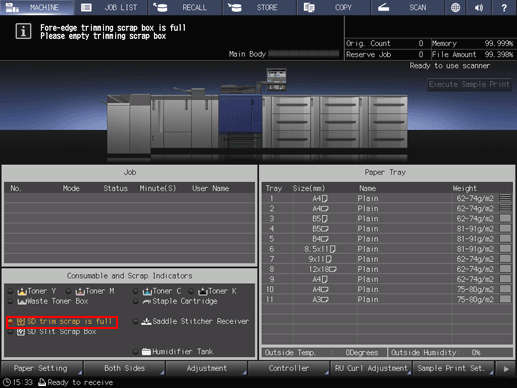 When the fore-edge trimming scrap box of Saddle Stitcher SD-513 becomes full, the following message appears in the message area of the screen.