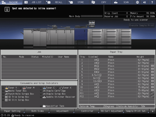 If spots such as paper powder or dust that should be cleaned off are detected on Inline Scanner1 or Inline Scanner2 of Intelligent Quality Optimizer IQ-501, any one of the following messages will be displayed in the message area of the screen, and the machine will stop.
