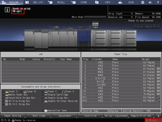 When the PM Call icon appears in the machine status indicator/right and the following message appears in the message area of the screen, contact your service representative for a periodical maintenance.