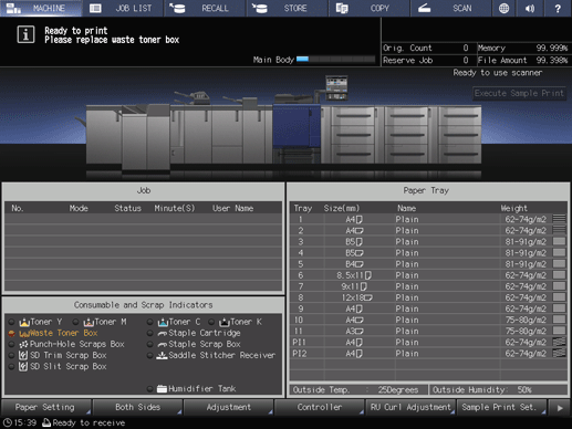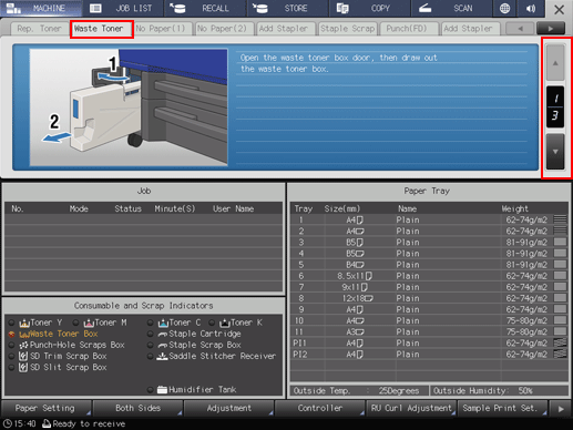 The Waste Toner Box indicator in the Consumable and Scrap Indicators area of the MACHINE screen lights up red and the text color changes to yellow to inform you that the waste toner box is becoming full.
