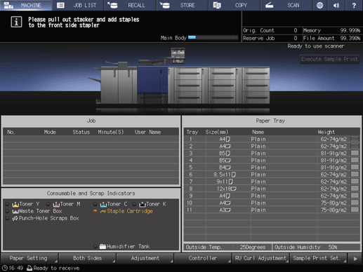 The staple indicator in the Consumable and Scrap Indicators area of the MACHINE screen lights up red, and the text color changes to yellow.