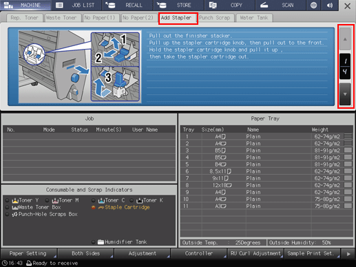 When the staple cartridge of Finisher FS-612 becomes empty, the following message will appear in the message area of the screen.