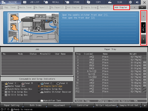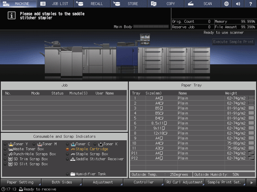 When the staple cartridge of Saddle Stitcher SD-513 becomes empty, the following message will appear in the message area of the screen.