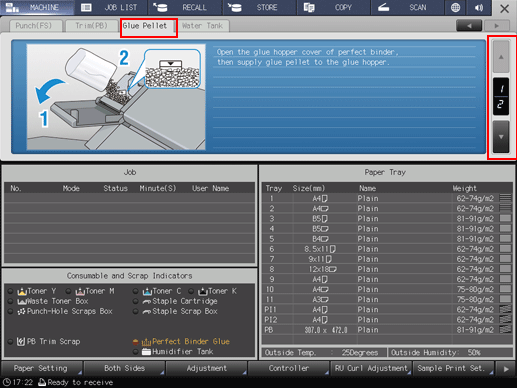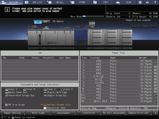 When Perfect Binder PB-503 is out of glue pellets, warm-up of the binder cannot be complete, resulting in the binding operation unavailable. In this case, the following message will appear in the message area of the screen.