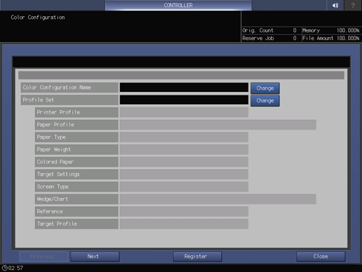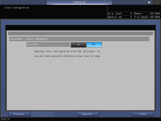 Adjustment / Result management | Checks whether the color configuration is operable. When you register the color configuration, this machine checks it based on the specified reference level. |