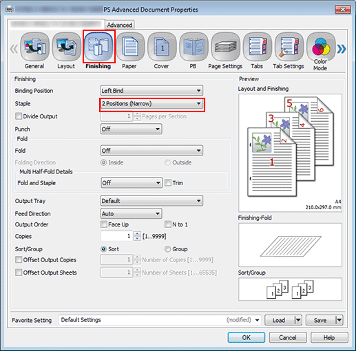 Click the Finishing tab, and then set Staple.