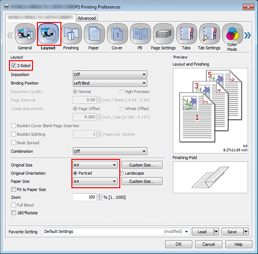 When setting in the printer driver, make sure that there are no previous settings left in each item in the tabs Layout, Finishing, Cover, etc.
