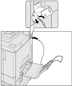 1. Push down the paper detection sensor of Multi Bypass Tray MB-506 and put Banner Tray Unit MK-740 or Output tray reinforcing unit for banner MK-740m (feeding extension tray) on the bypass tray from top right to cover it.