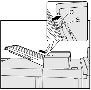 Insert the fitting (b) of Banner Tray Unit MK-740 (output extension tray) into the insertion opening (a) of the secondary (sub) tray.