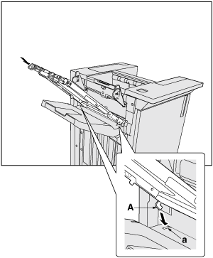 Insert the brackets (A) of Banner Tray Unit MK-740 or Output tray reinforcing unit for banner MK-740m (output extension tray) into the slots (a) of main tray.