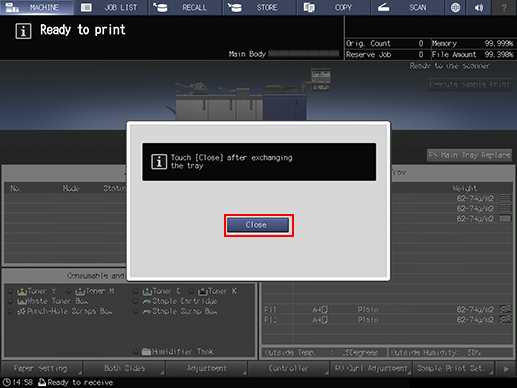 The dialog box is displayed, and the main tray lowers (approx. 5 cm).
