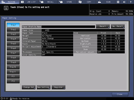 Press Paper Setting on the MACHINE screen to display the Paper Setting screen.