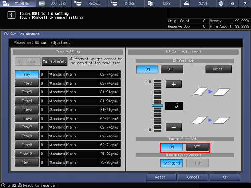 supplementary explanationPressing Reset returns the adjustment strength value to 0. When multiple trays are specified simultaneously, the adjustment strength values of all the selected trays return to 0.