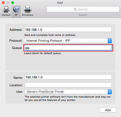 In Address, enter the IP address for this machine. In Queue, enter ipp.