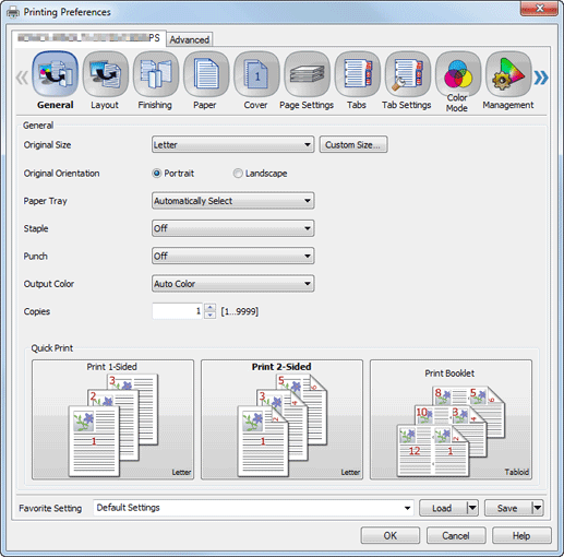 Original Size | The paper sizes registered as the standard paper sizes and custom sizes | Set a paper size of the original. When you select the PostScript Custom Page Size, the size specified by Custom Size is used. In addition, when you register the Custom Paper Size Name using the Custom Size - Add Custom Size, you can also select the name of the size. |