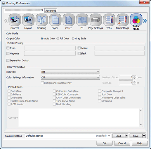 2-Color Printing | Cyan, Magenta, Yellow, Black | Set this to print with the specified 1 to 4 spot colors. Select Cyan, Magenta, Yellow, or Black. Specify spot color name from Spot Color Table Name, Spot Color Name. For details, refer to Spot Color: Printing in Special Colors. |