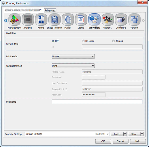 Select the method to handle a print job that is to be sent from the computer to this machine. When Print/Store on HDD, Store on HDD, or Secure Print is selected as the method, you need to enter Folder Name, Password, User Box Name, Secure Print ID, and Password.