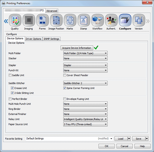 Destination Settings | To check device option information of another main body, select Specify IP Address or Printer Name, then enter the IP address or printer name. This function is helpful when the driver has the destination set to another server instead of the main body. |