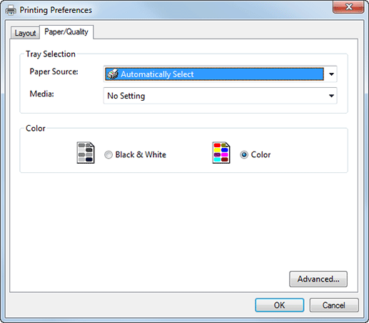 Paper Source | Automatically Select, Tray 1, Tray 2, Tray 3, Tray 4, Tray 5, Tray 6, Tray 7, Tray 8, Tray 9, Tray 10, Tray 11, Bypass Tray | Select a paper tray. |
