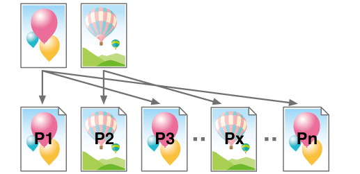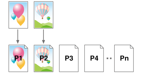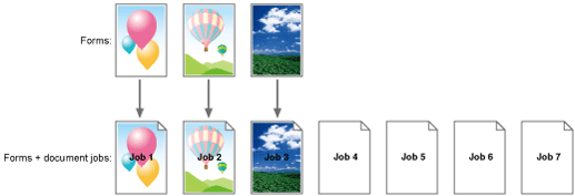 When a form has two pages, form page 1 is assigned to the first page of the job, form page 2 to the second page of the job, and form page 1 to the third page again as shown below. This pattern is repeated.