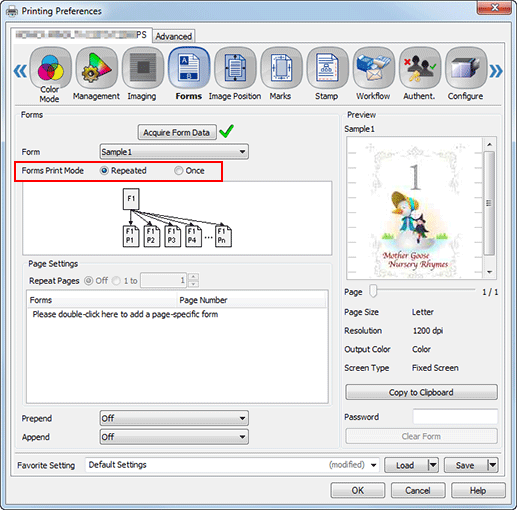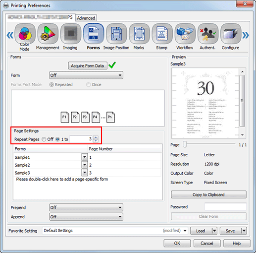 supplementary explanationRepeated: Superimposes a form on each page of a job to repeat printing. Only one or two pages can be set to a form.