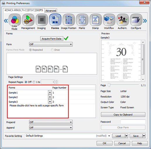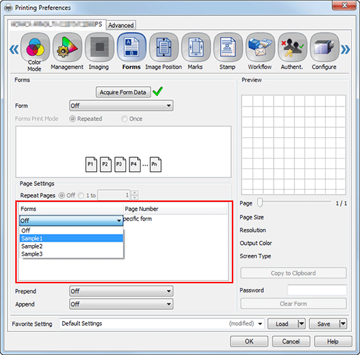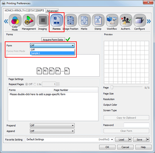 supplementary explanationIf the resolution of the form is different from that of the job, the form name is dimmed, which means the form is not available.