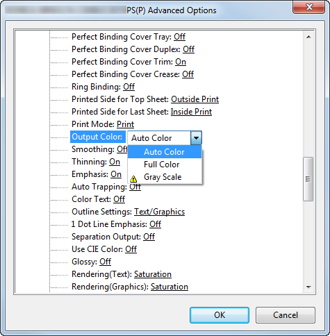 Gray Scale: Prints the original in black and white regardless of the color conversion result. When Gray Scale is selected, productivity is not reduced because the color mode is not switched for each process.