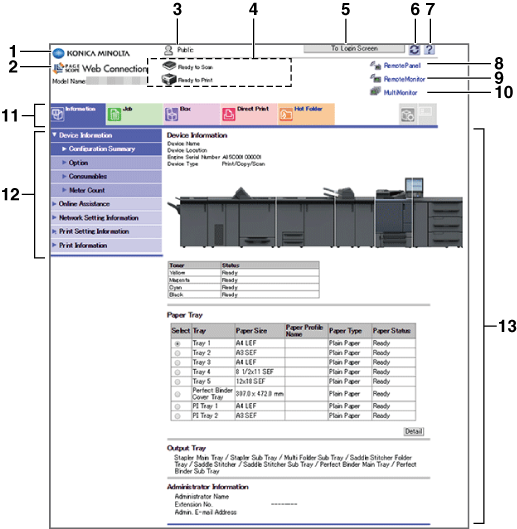 After the login to PageScope Web Connection, a screen such as shown below is displayed. The following shows an example of the screen displayed when Device Information is selected in the Information tab.
