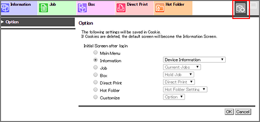 Job | Displays the Job tab after login. You can select which screen in the Job tab you want to display. |
