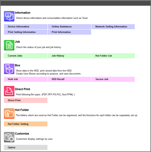 When the main menu is displayed, menu items that can be used in user mode are shown on a single screen.