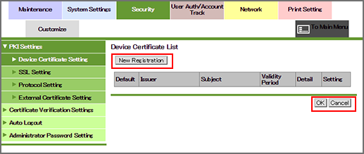 PKI Settings | Specifies the settings about certificates. Specifies the Device Certificate Setting, SSL Setting, device certificates assigned to a protocol, and External Certificate List. For details, refer to About Device Certificate Setting, PKI Settings: SSL Setting, About Protocol Setting, and About External Certificate Setting. |
