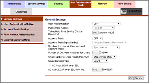 The User Auth/Account Track tab provides the settings concerning authentication functions of the machine.