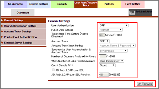 Specify whether or not to activate the account track function on the machine. Selecting ON sets the machine to ask the account authentication procedure before use.