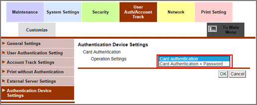 1. In Authentication Device Settings - Operation Settings, select Card authentication or Card Authentication + Password.