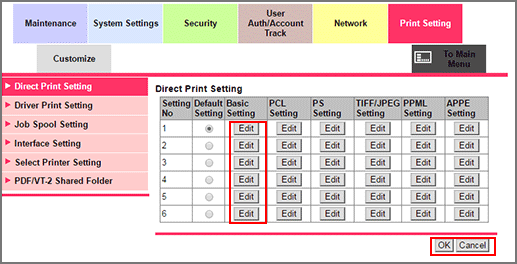 6 patterns of printer default settings for direct print can be registered. Settings selected by the Default Setting radio button can be displayed at Information - Print Setting Information.