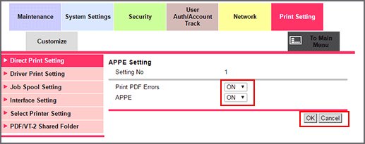 Select either ON or OFF in the Print PDF Errors drop-down list, and select either ON or OFF in the APPE drop-down list.