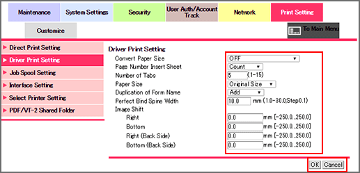Click Driver Print Setting on the menu of Print Setting tab to display this screen. This setting can be made also from Controller on the MACHINE screen. For details about the setting, refer to Driver Print Setting.