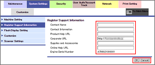 Click Register Support Information on the menu of System Settings tab to display this screen.