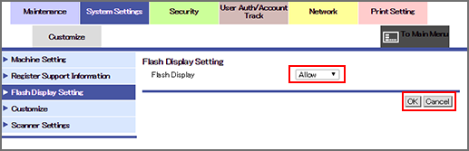 This screen enables you to specify whether to allow Flash to view PageScope Web Connection or not.