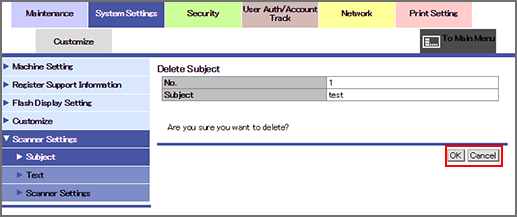 This screen allows you to edit or delete the subject of e-mail. When Default Address is set to E-mail in User Setting - Scan Setting - Scan Address Default Setting on the Utility menu, the subject that is selected during scanning is specified.