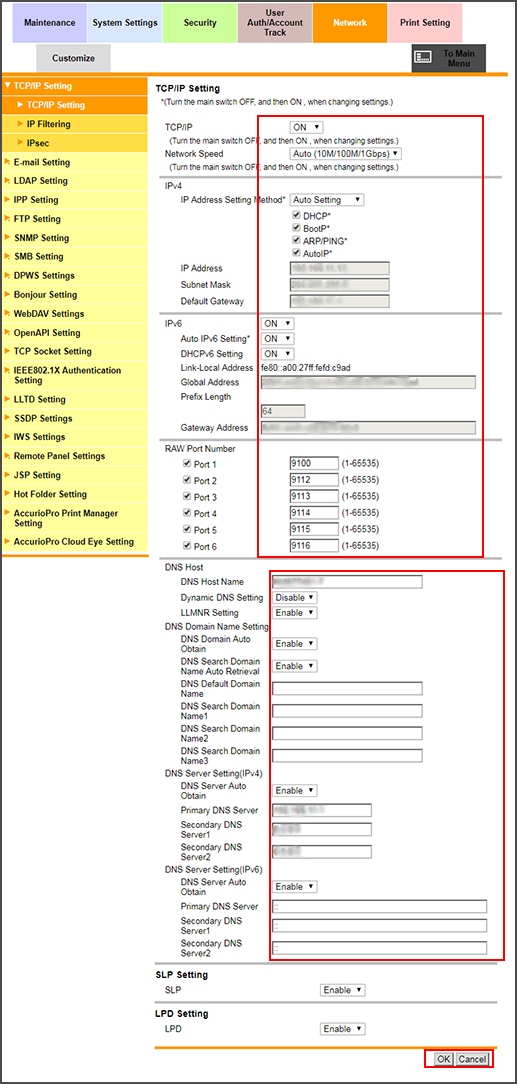 If you want to use host names for name resolution when accessing computers and servers on the network from the machine, configure DNS Server Setting (IPv4) and DNS Server Setting (IPv6) for IPv4 and IPv6 respectively.