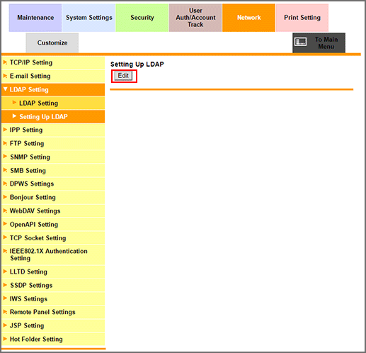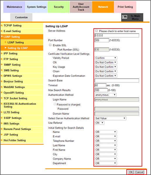 Click LDAP Setting - Setting Up LDAP on the menu of Network tab to display this screen.